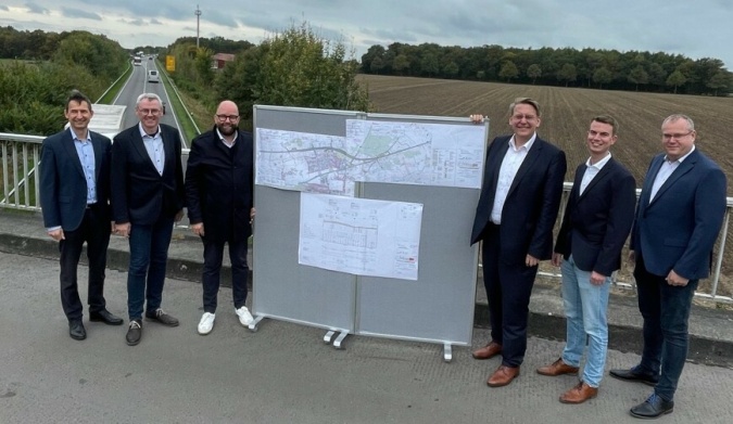 Bild: Roland Ribinski (Leiter Planungsamt Landkreis Cloppenburg), Ansgar Meyer (Erster Kreisrat Landkreis Cloppenburg), Johann Wimberg (Landrat Landkreis Cloppenburg), Marc-André Burgdorf (Landrat Landkreis Emsland), Matthias Ewerding (Leiter Sonderprojektgruppe E 233 Niedersächsische Landesbehörde für Straßenbau und Verkehr) und Michael Stüwe-Surmann (Abteilungsleiter Straßenplanung– und verwaltung Landkreis Emsland) freuen sich, dass ein wichtiges Etappenziel in den laufenden Planungen für den vierstreifigen Ausbau der Europastraße 233 erreicht ist. (Foto: NLStBV)